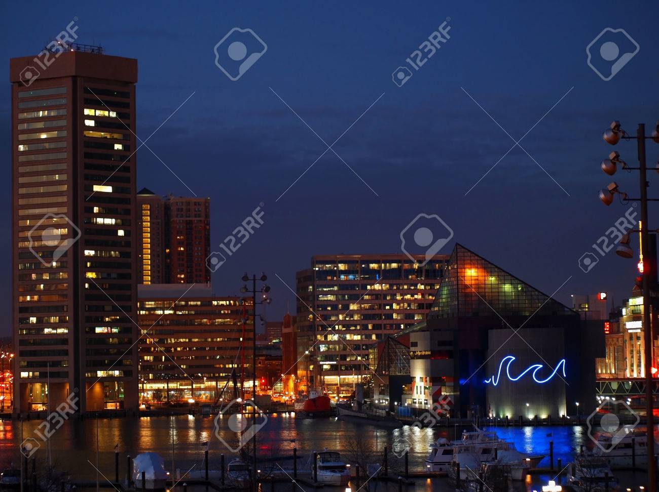 Baltimore Md February 11 2015 The World Trade Center The National Aquarium And Other Buildings Light Up The Night Sky Around Baltimore S Famous Inner Harbor In Baltimore Md Stock Photo Picture